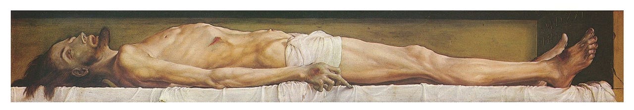 “There was no hint of beauty in Rogozhin’s picture . . . the face is terribly mangled by blows, swollen, with terrible, swollen, bloody bruises, the eyes open and unfocused; the whites wide open, gleaming with a kind of deathly, glazed lustre. But it’s odd; as you look at this corpse of a tortured man, a most curious question comes to mind; if a corpse like that (and it must certainly have been exactly like that) was seen by all his disciples, his future chief apostles, and seen by the women who followed him and stood by the cross, by all in fact who believed in him and worshipped him, how could they have believed, looking at such a corpse, that the martyr would rise again?”