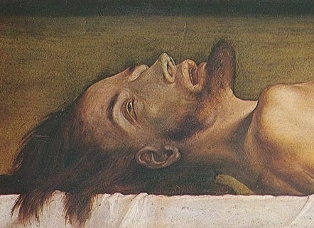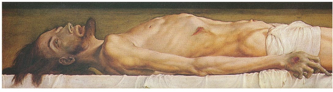 Which takes us back to Dostoevsky, as Ippolit continues his meditations on Holbein’s painting. Here Dostoevsky dwells on the reality that even Jesus’s closest disciples, who had literally seen Jesus perform miracles, were in a state of hopeless despair as they realized their master was not immune to the inevitability of death.